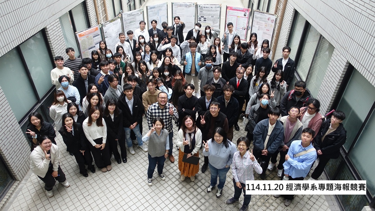 經濟學系於114年11月20日在商學大樓9樓中庭舉辦了「114學年度綜合專題研究海報競賽」,這是CDIO終端課程的一部分,展示了學生四年來的學習成果。此次競賽的研究議題涵蓋財經、薪資、經濟成長、旅遊經濟、ESG、房價,以及數位學習等,研究議題廣泛且具國際觀。